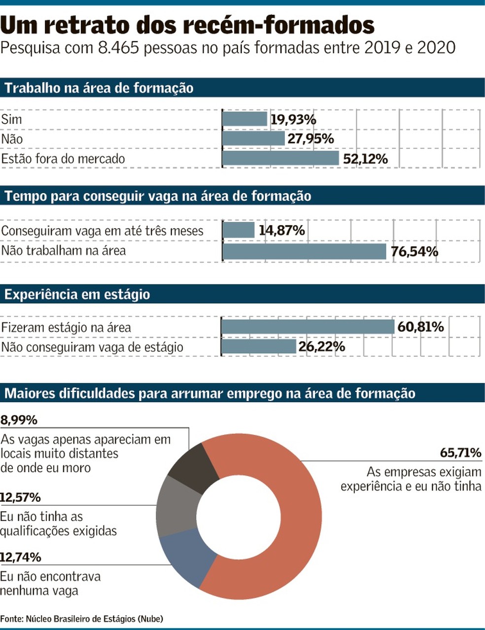 Uma pesquisa realizada com exclusividade para o Valor pelo Núcleo Brasileiro de Estágios (Nube) com 8.465 pessoas de todos os Estados formadas entre o fim de 2019 e de 2020 mostrou que apenas 14,87% delas conseguiram trabalho na área de atuação em até três meses de formados. Em pesquisa anterior, que contemplou o período de 2014/2018, a parcela era